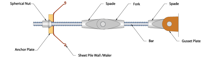 Tie Rods or tie backs are structural systems retaining single walls or connecting (tying) two opposing sheet pile or bored pile walls and prevent them from collapsing during excavation and backfill in between the two walls. Common application is marine ties used to tie permanent sheet pile walls together that are driven into place to form the later quay wall.